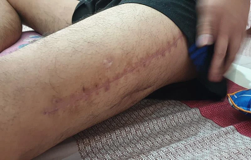 Đùi trái của Nguyễn Trọng Cường (32 tuổi) bị khâu nhiều mũi sau khi cảnh sát 113 nổ súng. Ảnh: ĐẶNG TRUNG