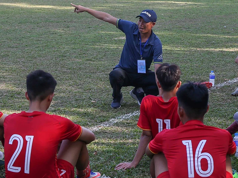 HLV Nguyễn Thành Lợi chỉ đạo các cầu thủ trẻ Bình Định, trong khi Ban Kỷ luật VFF ra quyết định phạt HLV khác đang đào tạo lứa cầu thủ khác ở nhà. Ảnh: ANH MINH