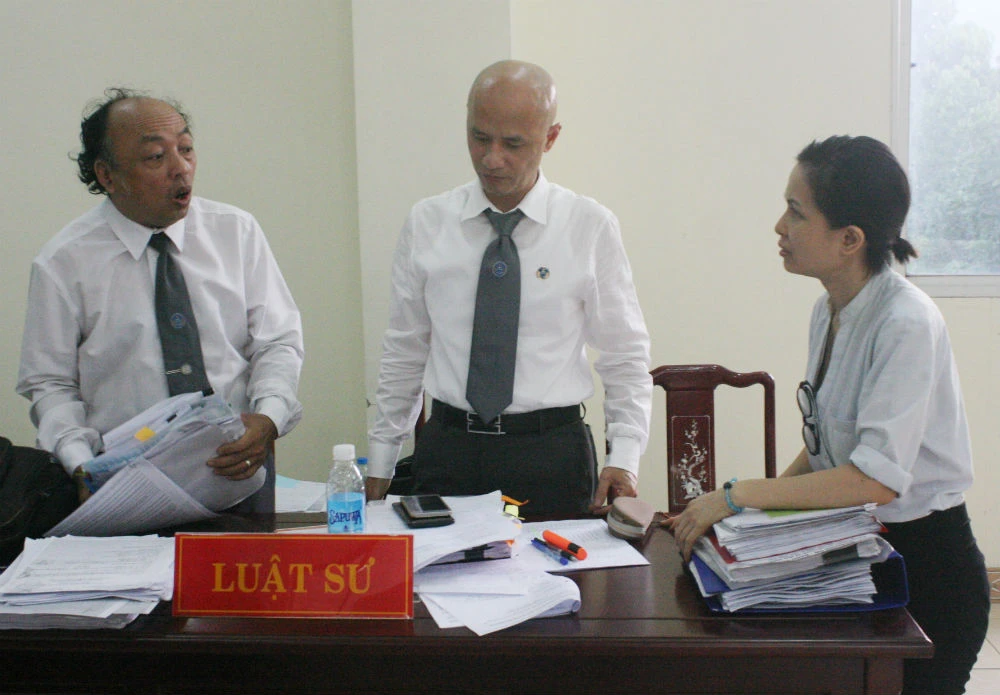Bà Trang (phải) trao đổi với Luật sư bảo vệ quyền lợi của mình tại tòa. Ảnh: VH.