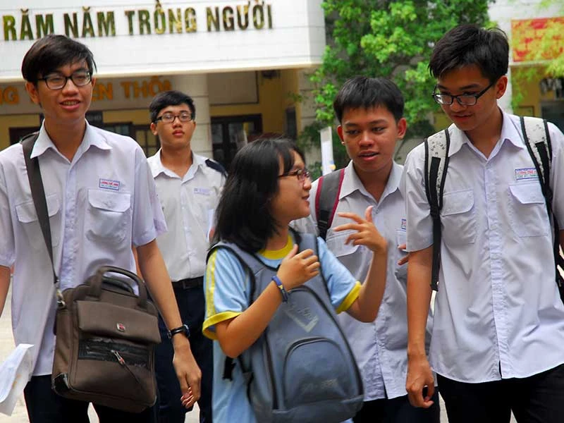 Các thí sinh trao đổi đề thi tại kỳ thi THPT quốc gia 2018. Ảnh: HTD