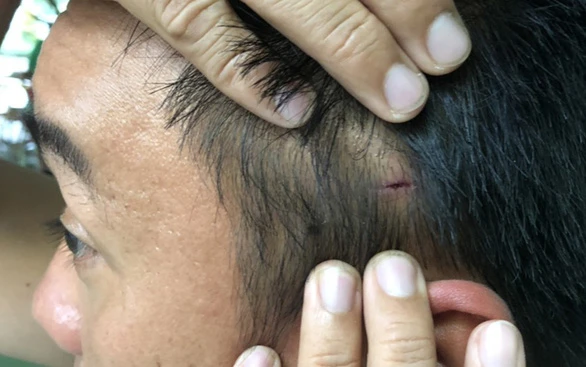 Vết rách da đầu của CSGT Lê Thành Tấn được cho là do người trên xe tải tấn công, xô ngã trúng thành xe. Ảnh: Trạm CSGT Tuy Phước cung cấp