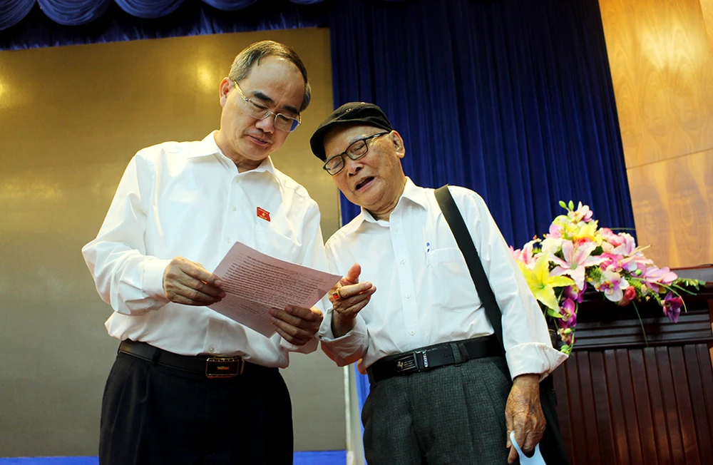 Bí thư Thành ủy TP.HCM Nguyễn Thiện Nhân trao đổi với cử tri bên lề buổi tiếp xúc. Ảnh: LÊ THOA