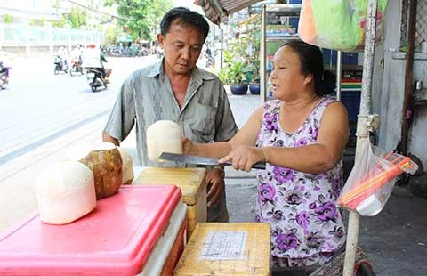 Chị Vân đang bày anh Thành cách chặt trái dừa sao cho không bị đổ nước ra ngoài. Ảnh: H.LAN