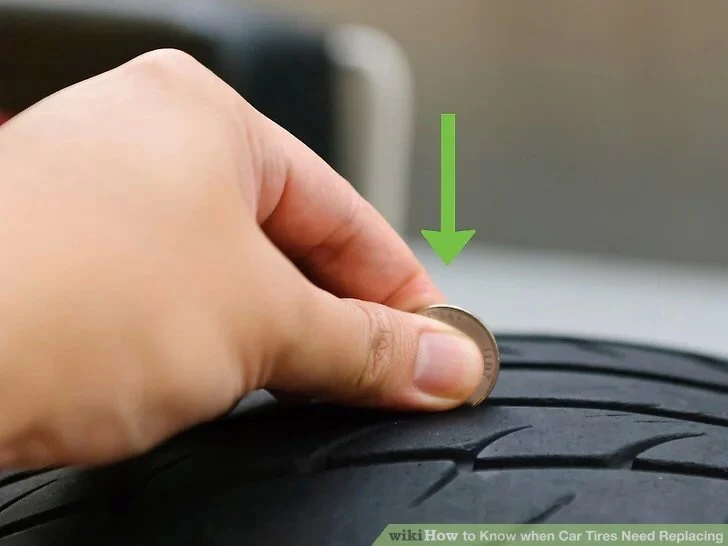 Kiểm tra độ mòn của lốp xe của bạn nhanh chóng bằng cách nhét một đồng xu vào các rãnh gai của lốp. Ảnh: wikiHow