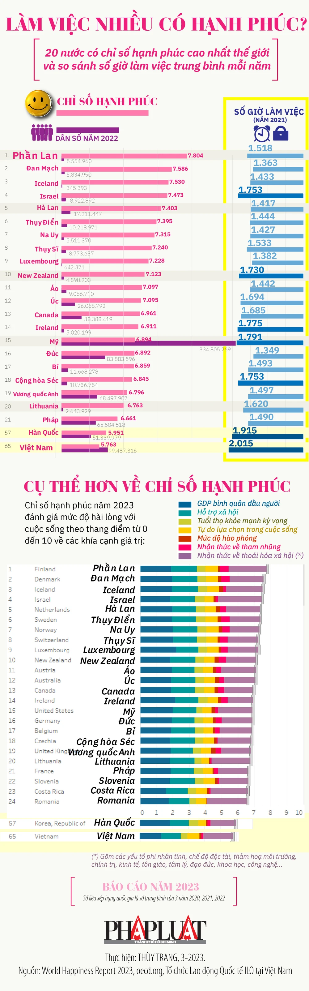 (PLO)- Ngày 20-3 hàng năm được Liên Hợp Quốc chọn là Ngày Quốc tế Hạnh phúc từ năm 2013. Tuy nhiên mới đây chính phủ Hàn Quốc đã bị phản ứng với kế hoạch nâng trần thời gian làm việc của người lao động từ 52 giờ/tuần lên 69 giờ/tuần. Hãy cùng PLO so sánh chỉ số hạnh phúc của 20 nước cao nhất thế giới và số giờ làm việc trung bình mỗi năm để trả lời câu hỏi "Làm việc nhiều có hạnh phúc không?".