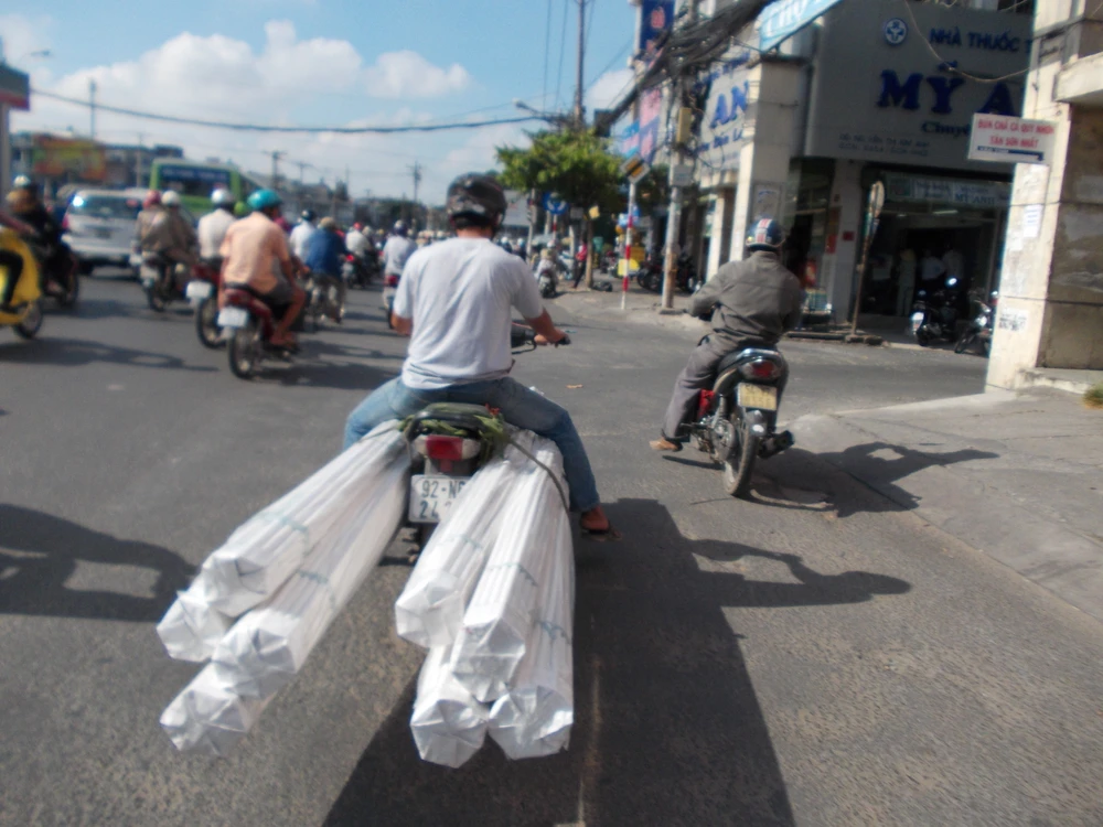 Chở kẹp 8 cuộn ống nhựa dài 3m lưu thông trên tuyến đường Nguyễn Kiệm( Gò Vấp) vào giờ cao điểm
