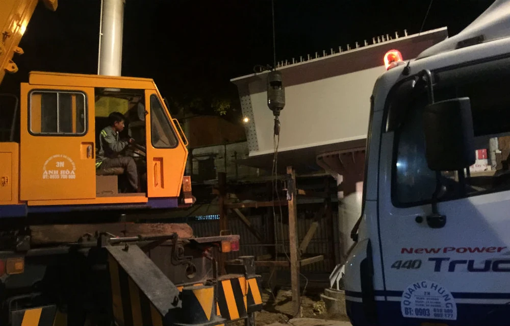 Đến gần 24 giờ đêm 29-11, khối dầm thứ hai của nhánh cuối cùng cầu vượt ngã bảy Phạm Văn Đồng bắt đầu được cẩu lên đưa vào đầu mũ trụ.