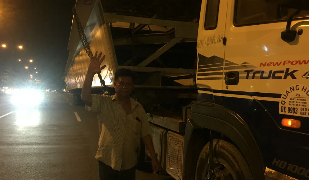 Trước đó, lúc 23 giờ đêm 29-11, chiếc dầm hộp thứ hai của nhánh cuối cùng cầu vượt ngã bảy Phạm Văn Đồng dài 36 m, nặng 63 tấn đã vượt hành trình hơn 30 km từ Biên Hòa về đến chân công trình. Trong ảnh: Ông Nguyễn Quang Hùng, Giám đốc DNTN Đào Vinh Hạnh, bày tỏ vui mùng khi đưa khối dầm thép siêu trường, siêu trọng về đến chân công trình.