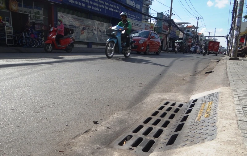 Miệng thu gom nước kiểu mới vừa lắp đặt thay thế những miệng cống cũ (để hở) trên đường Lê Văn Thọ (quận Gò Vấp, TP.HCM) được Sở GTVT TP đánh giá vừa giảm thiểu mùi hôi, vừa cải thiện khả năng thoát nước. Ảnh: TRUNG THANH