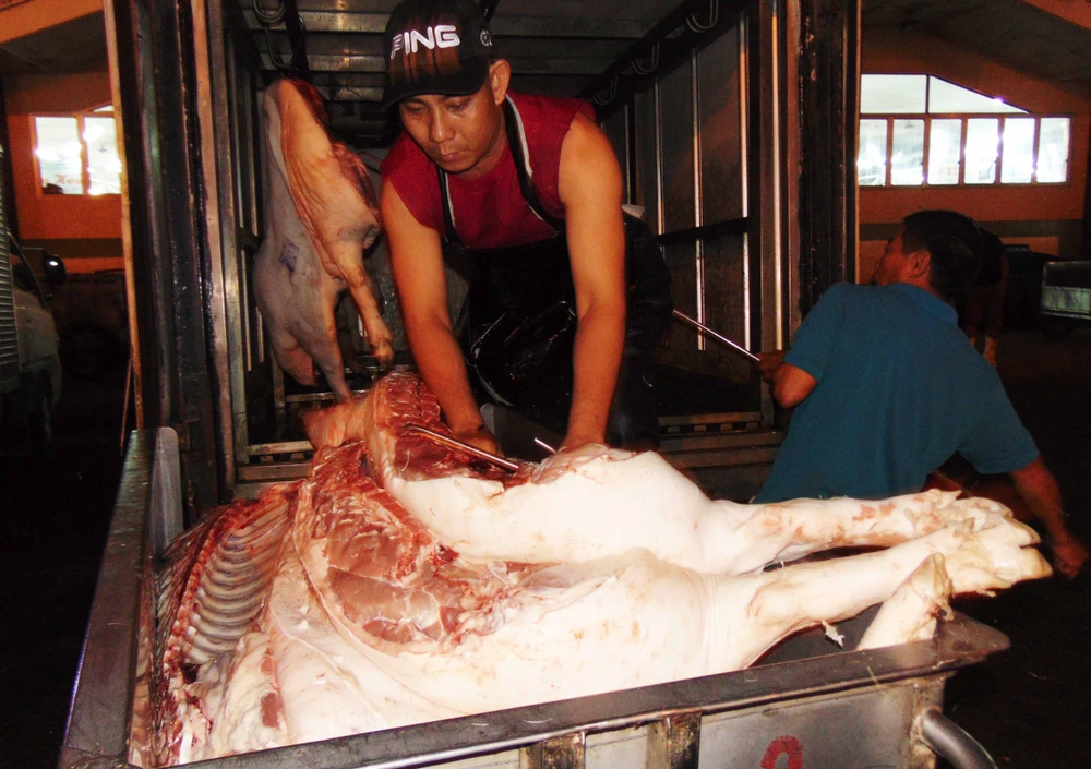 Thịt heo được chuyển xuống xe để đưa vào chợ kinh doanh. Ảnh: TRẦN NGỌC