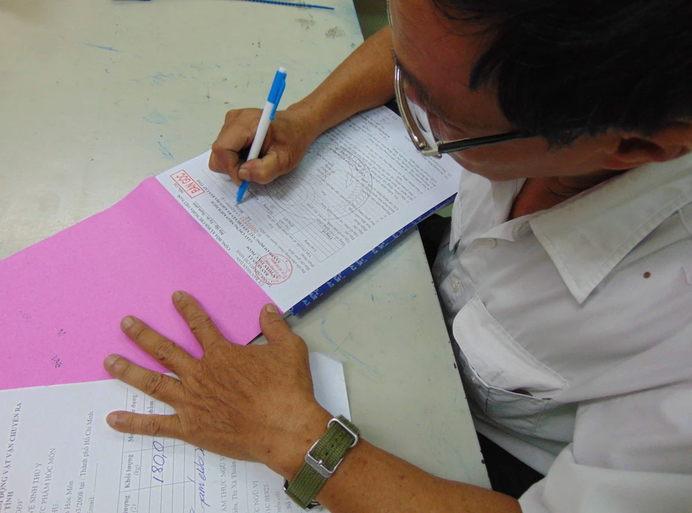 Nhân viên Ban Quản lý ATTP TP.HCM đang cấp giấy kiểm dịch ra khỏi TP cho doanh nghiệp. Ảnh: TRẦN NGỌC