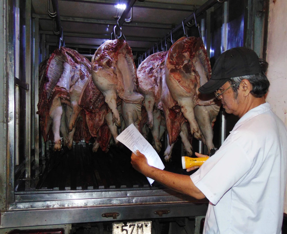 Xe chở thịt heo trước khi đưa vào kinh doanh được nhân viên của ban quản lý kiểm tra kỹ lưỡng số lượng được ghi trên phiếu vận chuyển. Nhân viên của ban quản lý còn kiểm tra thịt heo có được treo theo quy định trong quá trình vận chuyển. Do nhân sự của ban quản lý bố trí khá đông nên thời gian kiểm tra xe chở thịt rất nhanh, không bị ùn ứ.