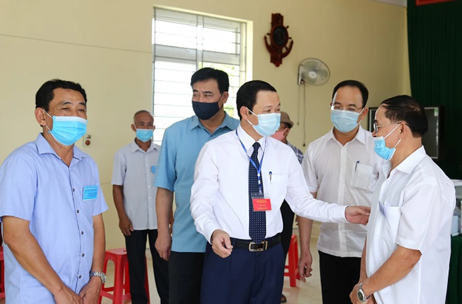 Ông Đỗ Minh Tuấn Chủ tịch UBND tỉnh Thanh Hóa, Chủ tịch Uỷ ban Bầu cử (đứng giữa) kiểm tra công tác bầu cử tại huyện Nông Cống (Thanh Hóa). Ảnh: P. SẮC
