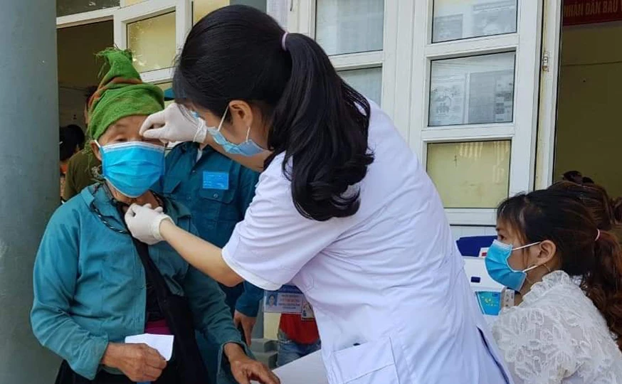 Người dân đồng bào huyện biên giới Mường Lát được cán bộ y tế hướng dẫn phòng chống dịch COVID-19 trước khi bỏ phiếu bầu cử. Ảnh: Đ.T
