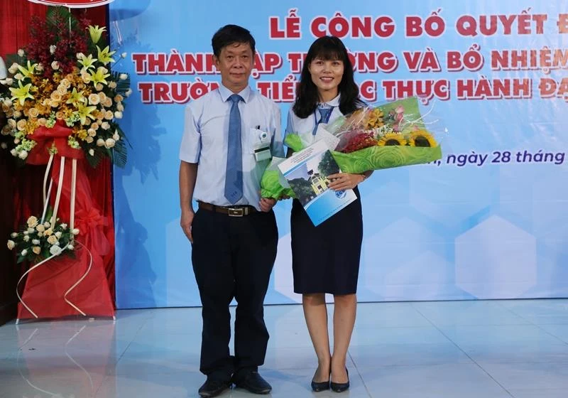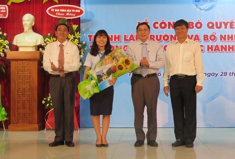 Đại diện UBND TP.HCM và Sở GD&ĐT TP trao quyết định bổ nhiệm hiệu trưởng trường tiểu học này cho bà Phạm Thị Thanh Tú.