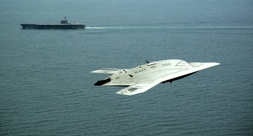 Mẫu máy bay chiến đấu không người lái X-47B bay trình diễn gần tàu sân bay USS H.W Geogre Bush