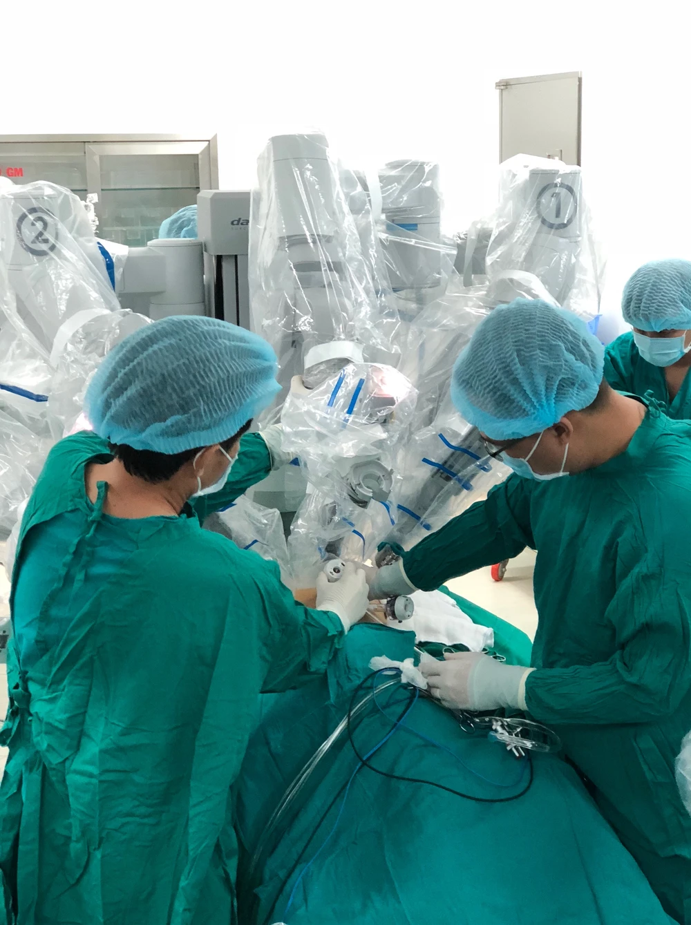 Các bác sĩ đang tiến hành phẫu thuật robot cắt tuyến ức cho bệnh nhân. Ảnh: HL