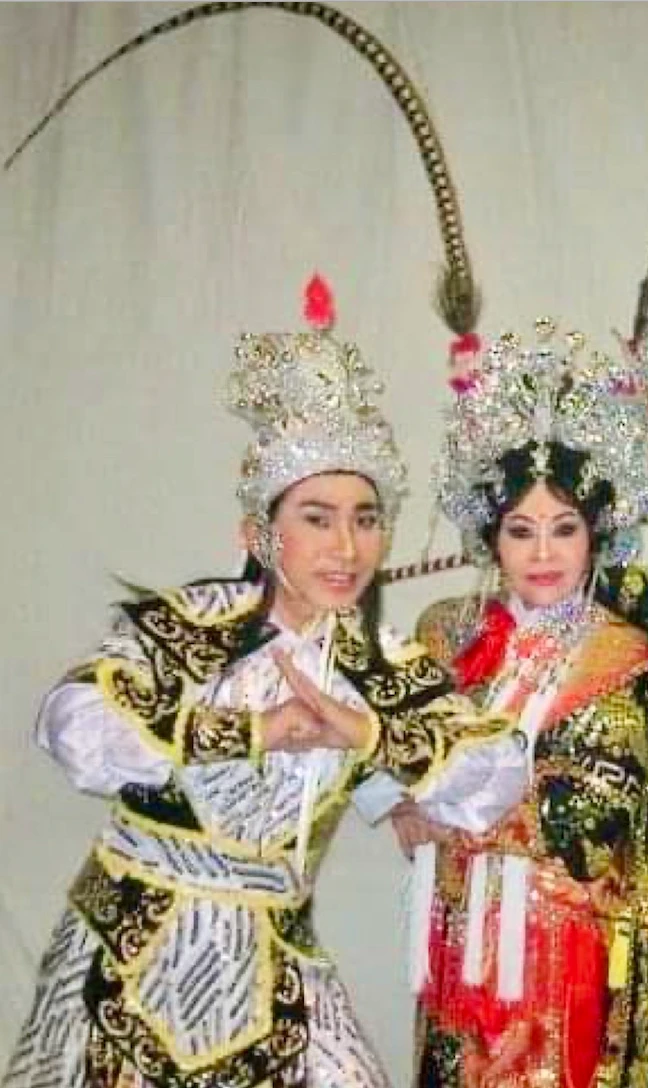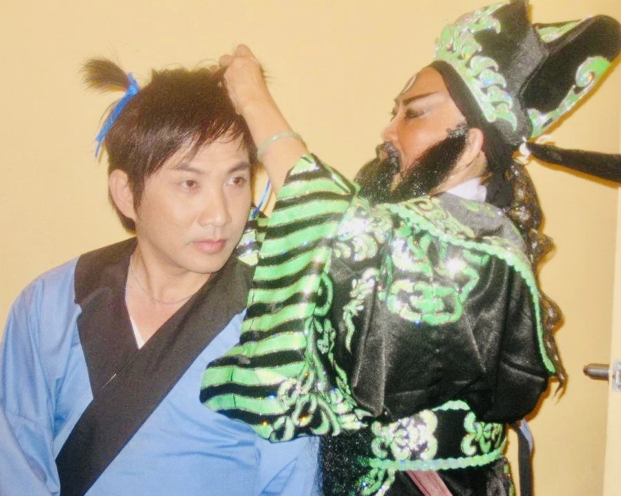 Nghệ sĩ Ngọc Đáng (phải) và ca sĩ Quang Thành trong trích đoạn “ Phan lê huê giao tử“. Ảnh: NSCC