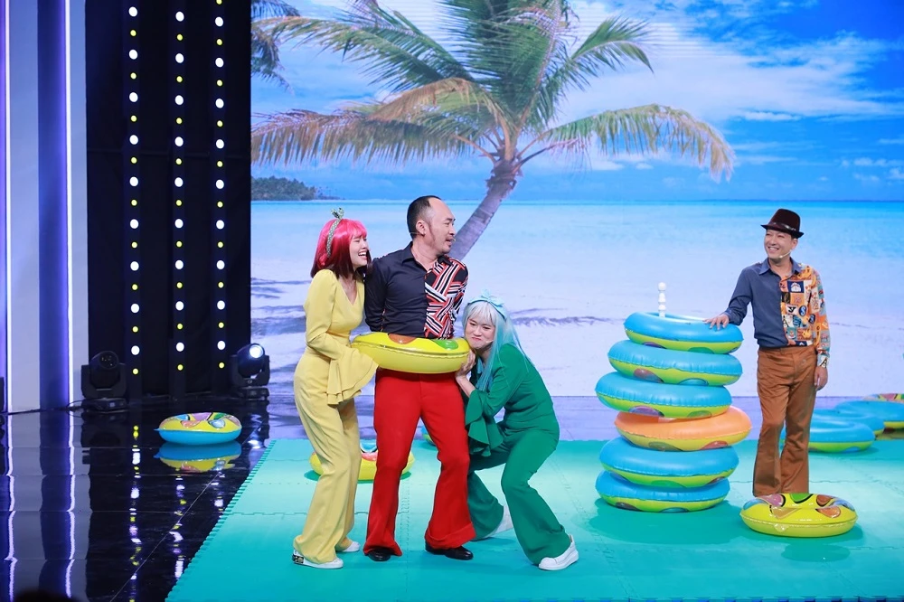 Để tăng thêm phần kịch tính, MC Trường Giang đề nghị Lan Ngọc và Lâm Vỹ Dạ hãy giúp Tiến Luật chui lọt chiếc phao nhỏ nhất.