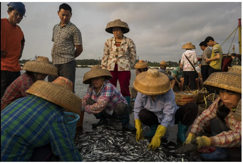 Ngư dân Trung Quốc phân loại cá sau khi đánh bắt được gần Hải Nam ở biển Đông. Nguồn: Washington Post