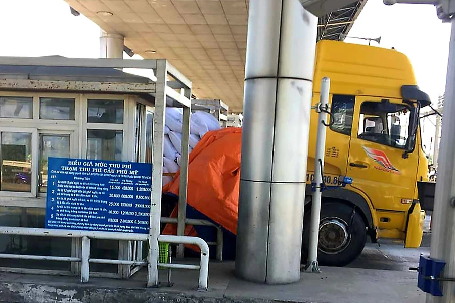 Đầu giờ chiều 1-7, xe container 51C-490… đã mua vé tháng vào làn thu phí tự động (làn ETC) trạm thu phí cầu Phú Mỹ. Khi xe đến sát nhưng barier không mở, tài xế đã thắng gấp khiến hàng hóa trên xe bị xáo trộn, rất may không bị đổ xuống lòng đường.