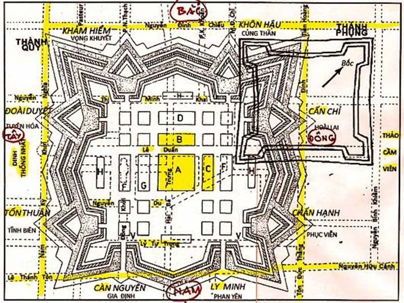 Vị trí thành Bát Quái và thành Gia định mới thu nhỏ.