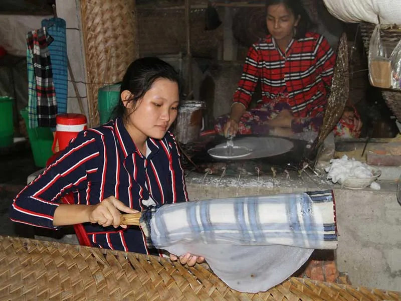 Ngay từ sáng sớm nhiều mẻ bánh đã được ra lò. Nhịp sống lao động nơi đây vô cùng nhộn nhịp, ai cũng tất bật với công việc của mình, người tráng, người lấy bánh, người phơi bánh. Các ống khói đốt lò tráng bánh tỏa ra từ nhiều căn nhà.