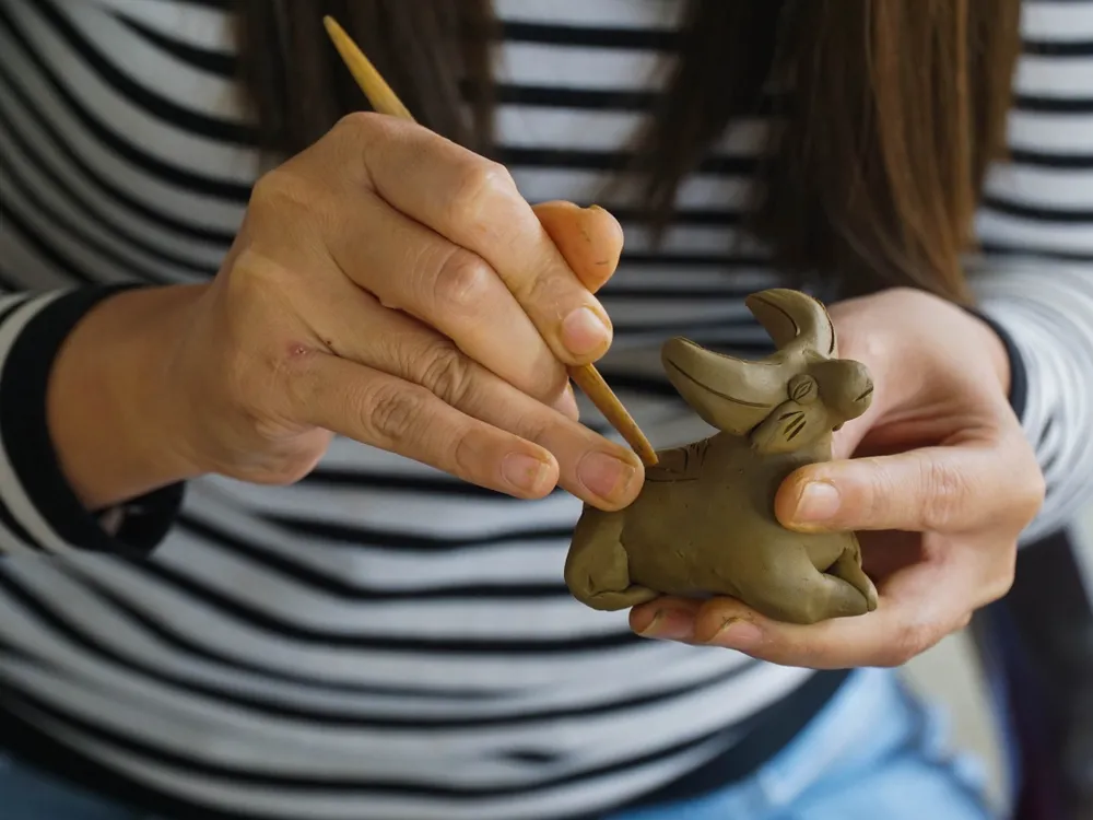 Để làm được trâu gốm, những người thợ phải kiên trì, tỉ mỉ nhào nặn đất sét, tạo hình rồi đem đi phơi nắng trong khoảng 7 ngày. Sau đó, thợ gốm sẽ lấy sản phẩm linh vật cho vào lò nung với nhiệt độ cao, rồi đánh bóng hoàn thiện.