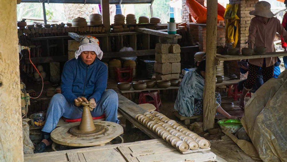Ở lò gốm chị Hòa, các công đoạn như dựng khuôn, trộn đất sét, đưa gốm vào lò nung đều do các thành viên trong gia đình thực hiện. Không khí làm việc rộn ràng, hối hả từ sáng đến chiều tối.