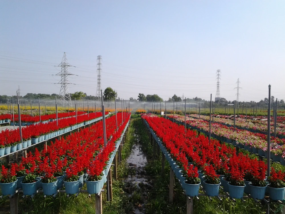 Hệ thống tưới phun sương ở luống hoa vạn thọ.