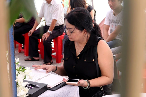 Ca sĩ Kim Lệ viết trong sổ tang mong người nhạc sĩ ra đi bình an. Ảnh: HOÀNG GIANG