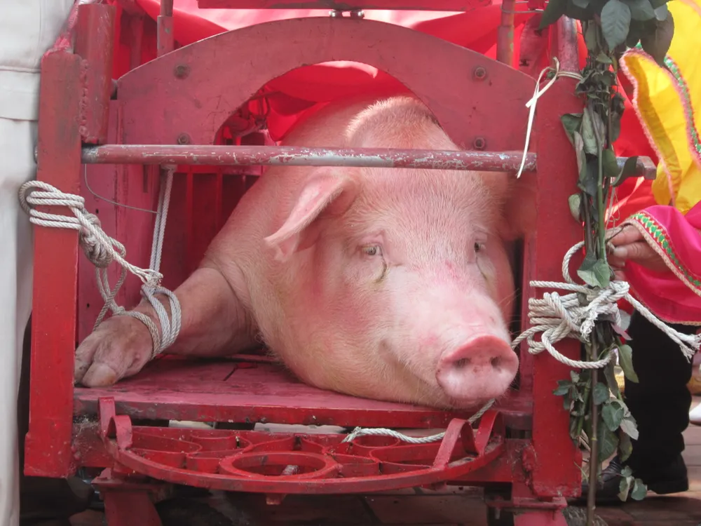 Khác với mọi năm, năm nay việc chém lợn ở đây không còn diễn ra công khai giữa sân đình mà được thực hiện ở phía sân bên trái. Khu vực chém hai “ông ỉn” được dựng rạp quây bạt kín, chỉ có một số cụ bô lão trong làng và hai thủ đao cùng các cán bộ của địa phương được vào trong, còn lại người dân không được phép vào chứng kiến việc chém lợn.