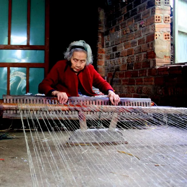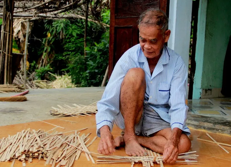 Điều khiến chúng tôi ấn tượng nhất có lẽ là hình ảnh một cụ bà đang ngồi bên khung dệt chiếu dù tuổi đã khá cao. Qua tiếp xúc, cụ cho biết tên là Lê Thị Thêm, năm nay đã bước sang tuổi 96. “Giờ già rồi nhưng cũng muốn làm cho vui và cũng để giữ lửa nghề truyền thống. Đã 80 năm miệt mài với nghề, giờ tuy gần đất xa trời nhưng không thể rời tay được” - cụ Thêm chia sẻ.