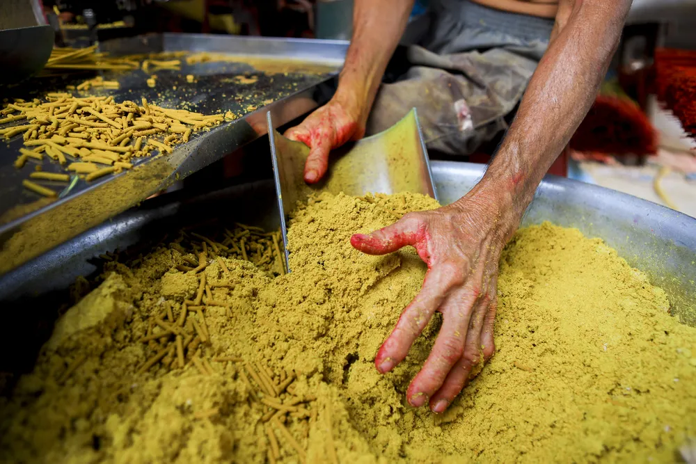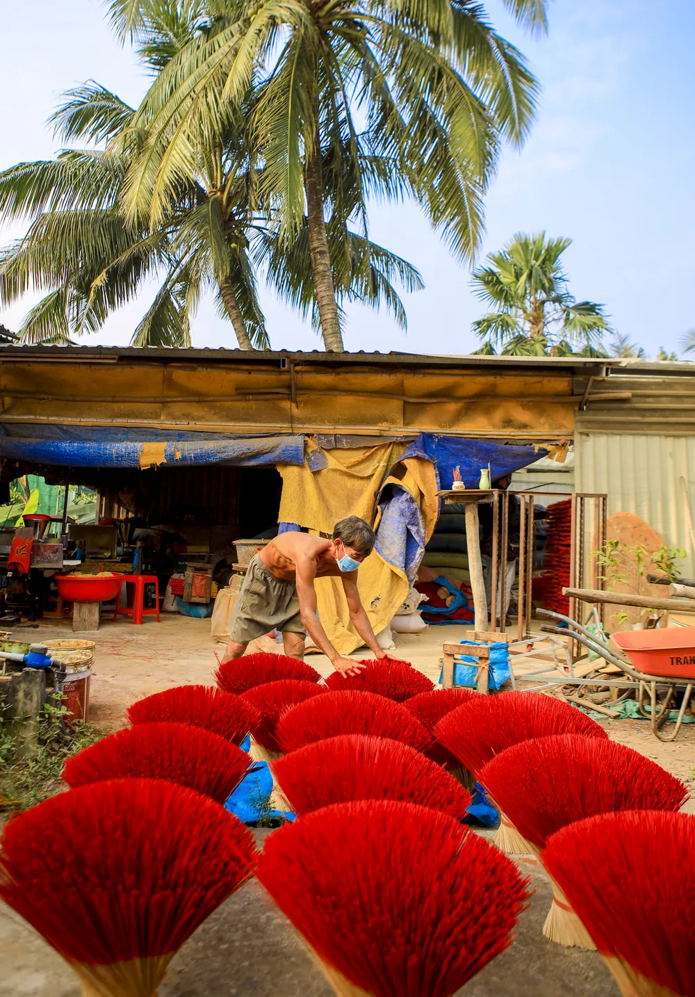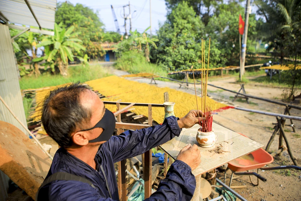 Mỗi ngày, cả nhà ông Bảy đều tranh thủ thức dậy từ 4 giờ 30 phút sáng để nhuộm tăm, se nhang. Ông Bảy cho biết, nhà ông cũng như nhiều hộ dân xung quanh không có hàng trữ cho Tết và cho khách sỉ vì ảnh hưởng của dịch bệnh. Do vậy, thời điểm này mọi người phải tập trung sản xuất, sản lượng tăng gấp đôi so với Tết năm ngoái.