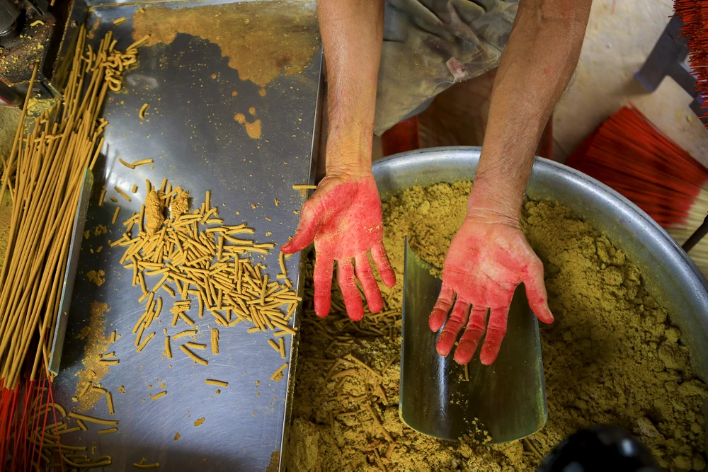 Bột nhang chủ yếu được làm từ mùn cưa của thân cây dó bầu, cây lồng mức... Mùi hương của nhang thì tùy vào nhu cầu của khách hàng mà nhào trộn cho phù hợp, có hương trầm, hương quế, hương tùng... Khi trộn, người thợ sẽ cho keo vào để kết dính bột nhang.