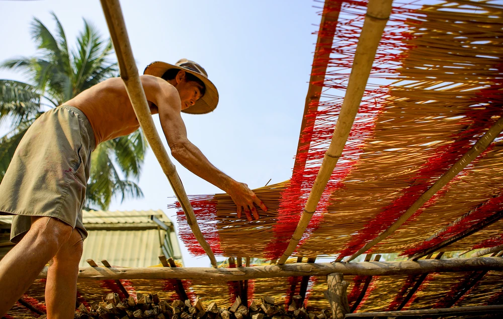 Một tháng trước Tết âm lịch, đường Mai Bá Hương (xã Lê Minh Xuân, huyện Bình Chánh, TP.HCM) trở nên rực rỡ, nhộn nhịp hơn bao giờ hết khi nhiều hộ gia đình tất bật cho công việc làm nhang có từ bao đời nay. Ông Nguyễn Văn Bảy (54 tuổi, người có thâm niên làm nhang gần 20 năm) tranh thủ những ngày trời nắng to để phơi nhang, kịp cung cấp cho thị trường.