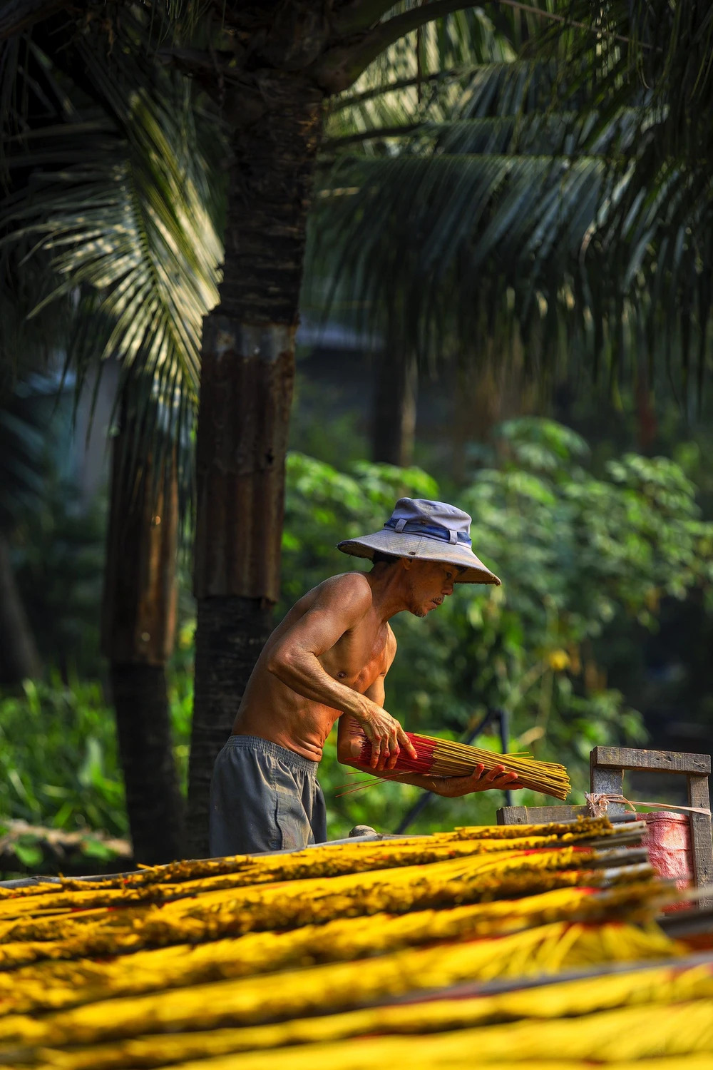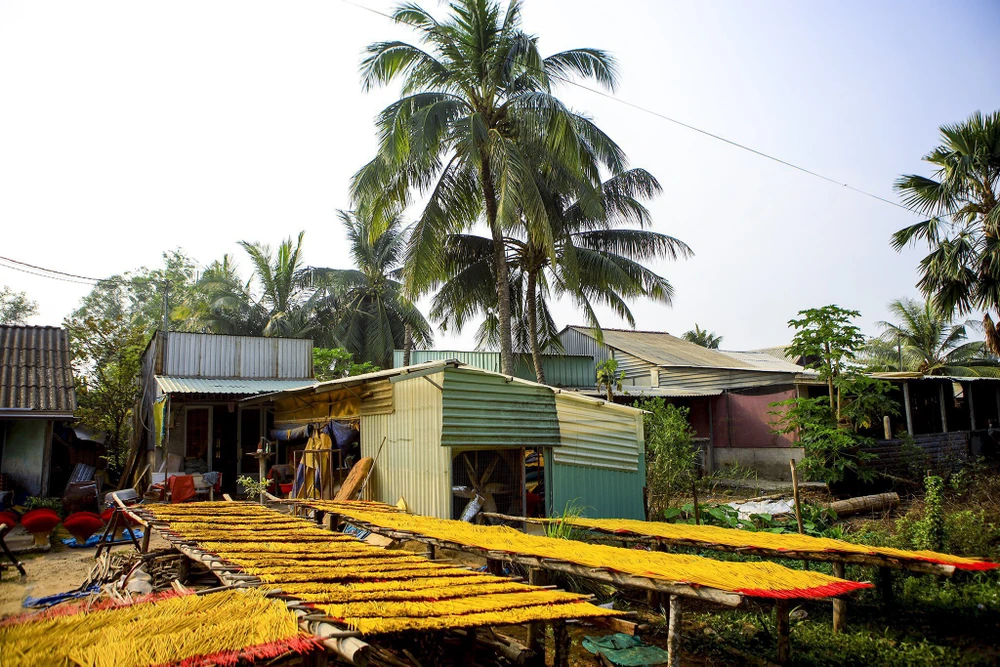 Tranh thủ một buổi sáng nắng đẹp, ông Bảy phơi những bó tăm nhang để kịp làm cho thiên tiếp theo. Những bó tăm nhang được người thợ xòe tròn và phơi khoảng một ngày trước khi đưa vào sản xuất.