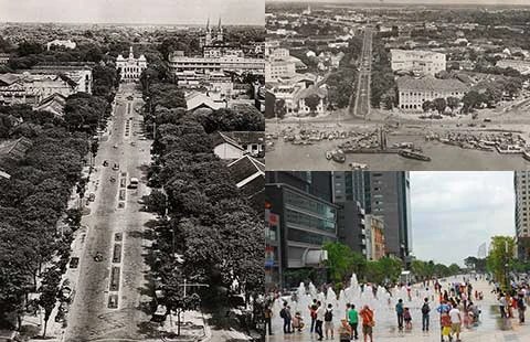 Ảnh 1: Đường Hàm Nghi ngày xưa. Ảnh tư liệu. Ảnh 2: Đường Nguyễn Huệ ngày xưa. Ảnh tư liệu. Ảnh 3: Phố đi bộ trên đường Nguyễn Huệ nhìn ra sông Bạch Đằng. Ảnh: HTD