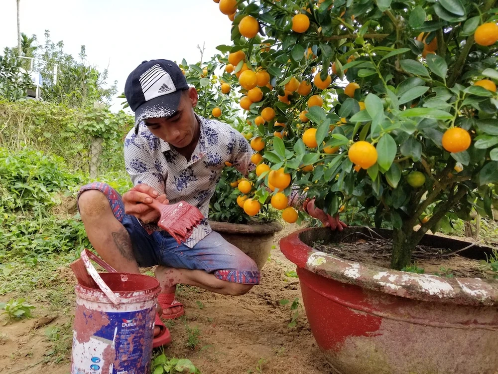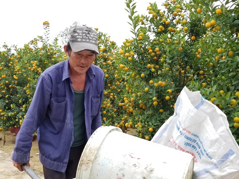 Cạnh vườn quất nhà ông Thẩn, ông Nguyễn Văn Năm chia sẻ, để có một chậu quất lớn bán chơi tết, thời gian chăm sóc phải hơn ba năm. Hai năm trồng quất trên đất, tầm tháng 8 đến tháng 10 năm trước sẽ cho vào chậu chăm bón rồi qua năm sau xuất bán.