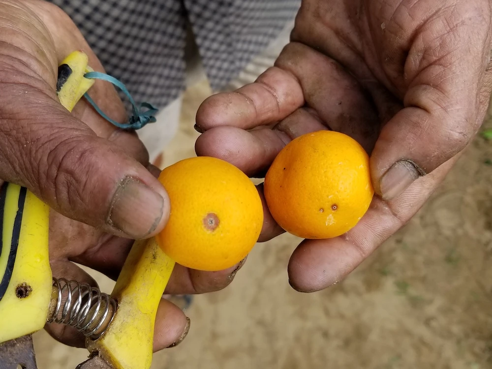 Ông Thẩn cho biết ong rất thích mùi thơm của quất nên phải dùng thuốc ngừa ong. Trên tay ông là quất bị ong chích phải cắt bỏ. Ảnh: THANH NHẬT.