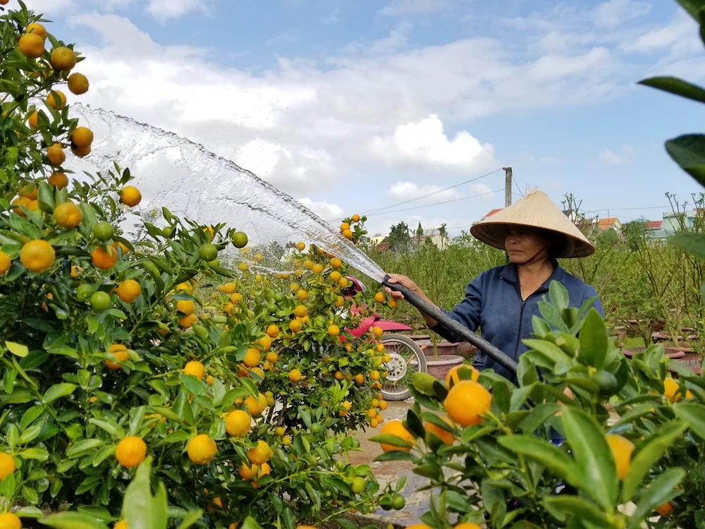 Tưới nước cho quất chờ ngày thương lái đến chở đi. Ảnh: THANH NHẬT.