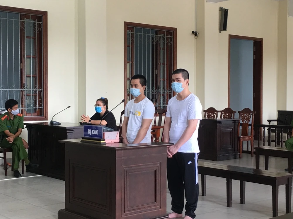 Hai bị cáo Phúc (bìa trái) và Trung tại tòa ngày 21-4. Ảnh: NHẪN NAM