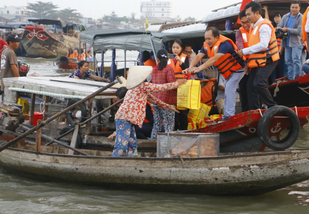 Phó Chủ tịch TP Cần Thơ Trương Quang Hoài Nam cùng lãnh đạo các ban ngành và địa phương tặng quà tết cho người dân tại Chợ nổi Cái Răng.