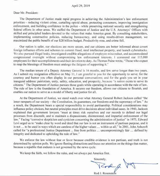 Trong thư từ chức, ông Rosenstein hết lòng ca ngợi tính cách cũng như những mục tiêu chính sách của Tổng thống Trump.