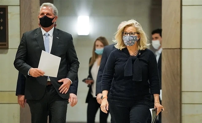 Lãnh đạo phe thiểu số Cộng hòa tại Hạ viện Kevin McCarthy (trái) và Chủ tịch Hội nghị đảng Cộng hòa Hạ viện Liz Cheney (phải). Ảnh: THE HILL