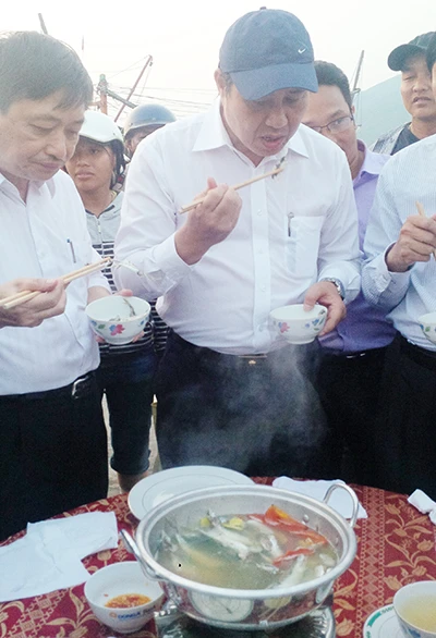 Ông Huỳnh Đức Thơ, Chủ tịch TP Đà Nẵng (đội mũ), ăn cá được nấu trực tiếp tại cảng Thọ Quang. Ảnh: LÊ PHI