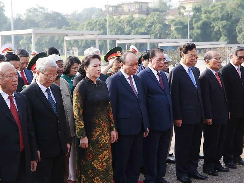 Đoàn đại biểu lãnh đạo, nguyên lãnh đạo Đảng, Nhà nước và MTTQ Việt Nam đến đặt vòng hoa và vào Lăng viếng Chủ tịch Hồ Chí Minh. Ảnh: TTXVN