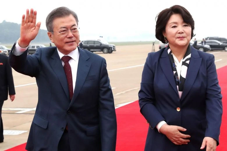 Tổng thống Hàn Quốc Moon Jae-in và phu nhân tại sân bay quốc tế Sunan, trước khi lên chuyên cơ riêng đến thăm núi Paekdu. Ảnh: AFP