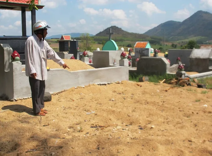 Cha nạn nhân chỉ nơi con trai bị chôn cất không có người thân. Ảnh: TẤN LỘC