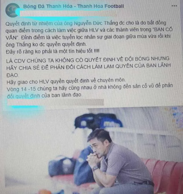 Trang bóng đá Thanh Hóa chia sẻ và bất bình việc HLV Đức Thắng như bị ép ra đi bởi “ông chủ” can thiệp quá nhiều vào chuyên môn.